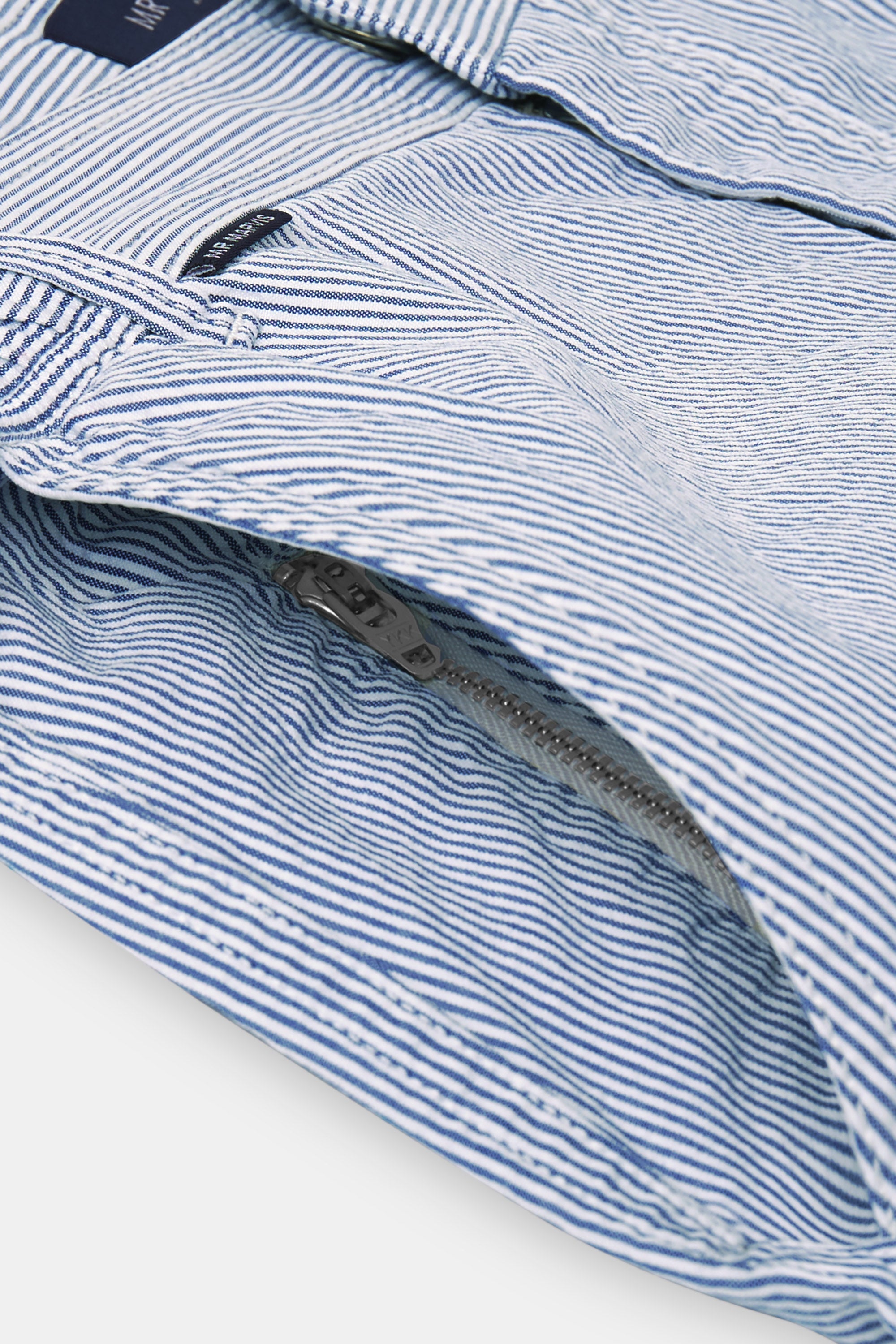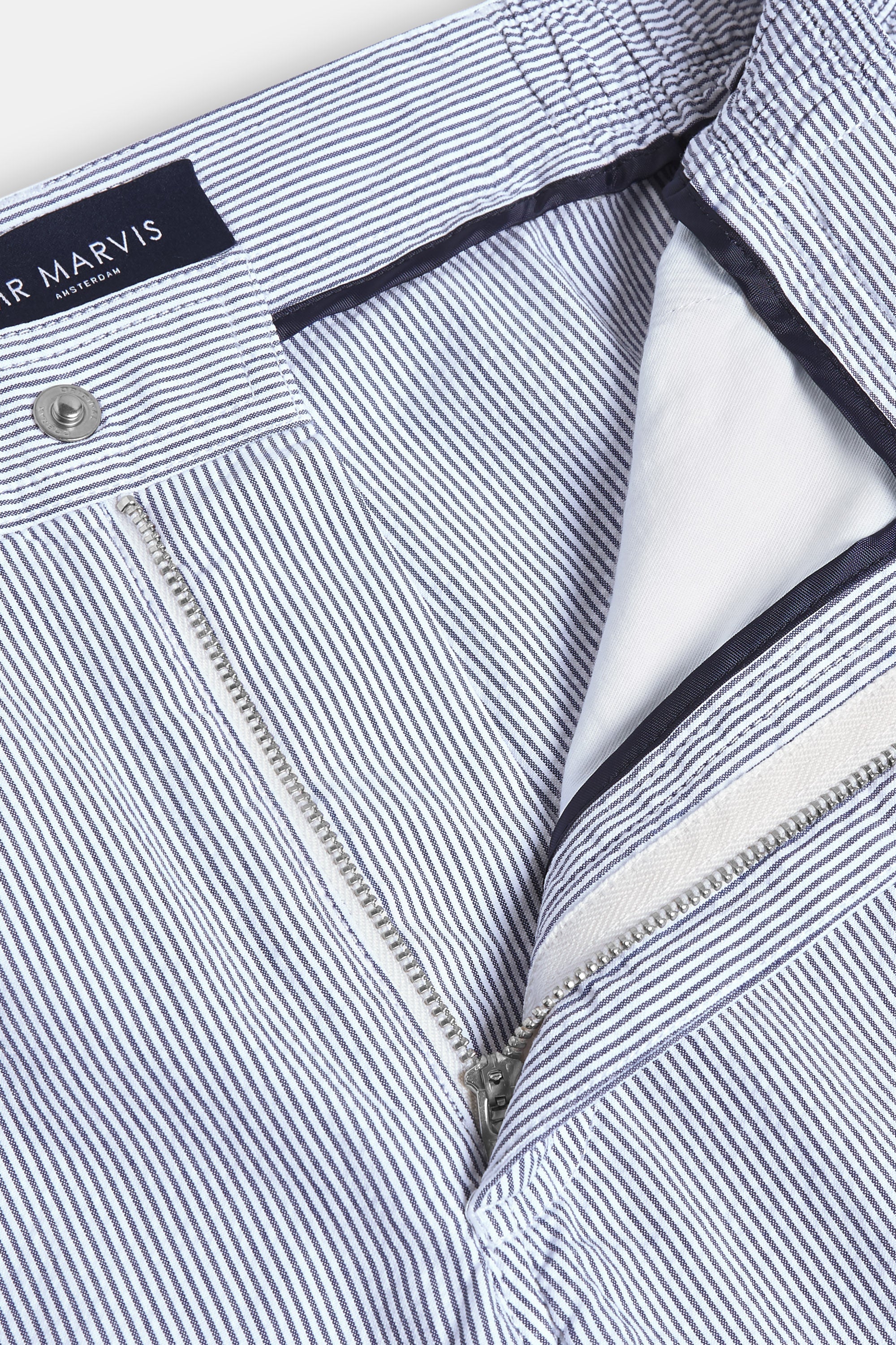 Meet The Seersuckers Catamarans: MR MARVIS' dark blue and white striped 100% organic cotton men's shorts.
