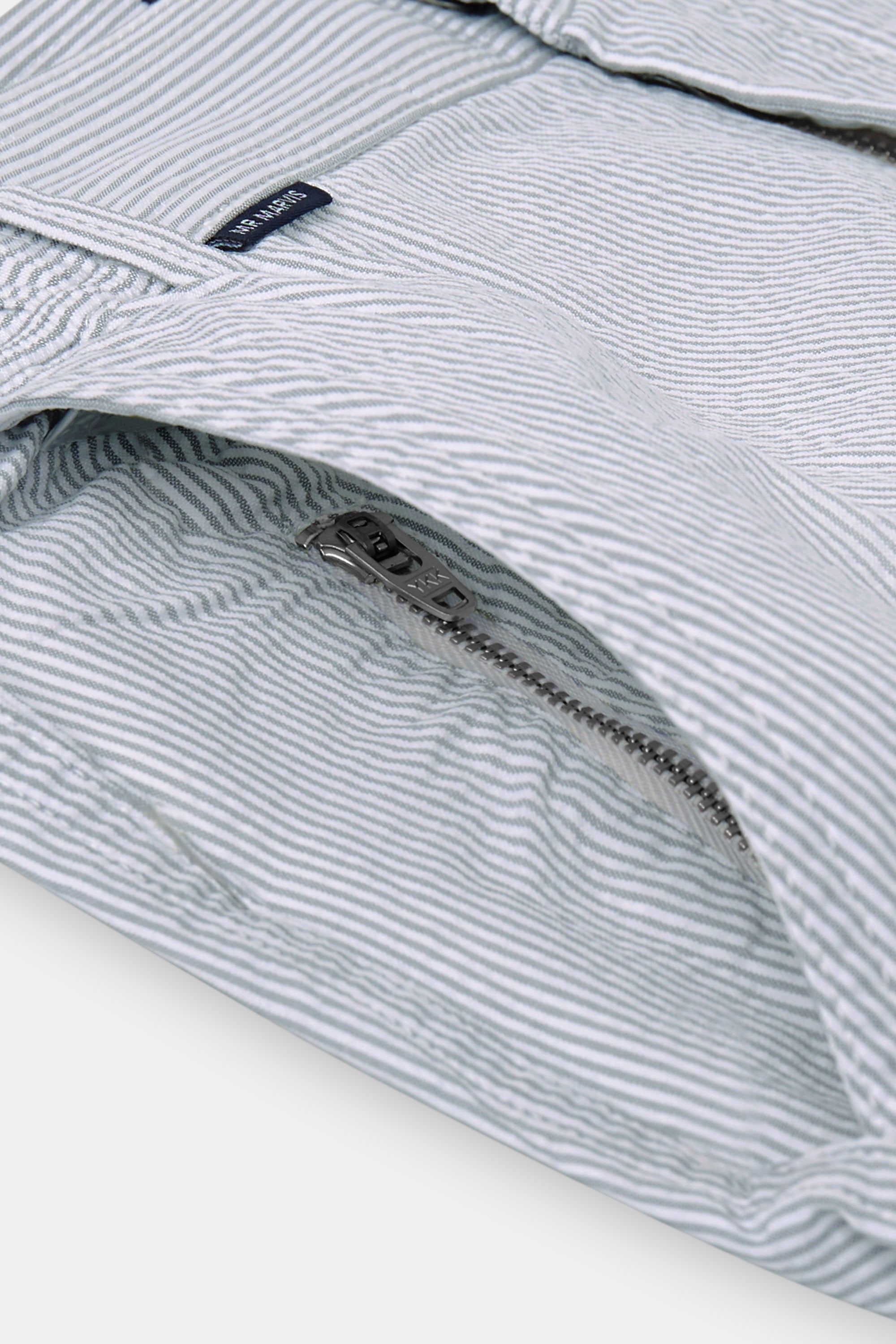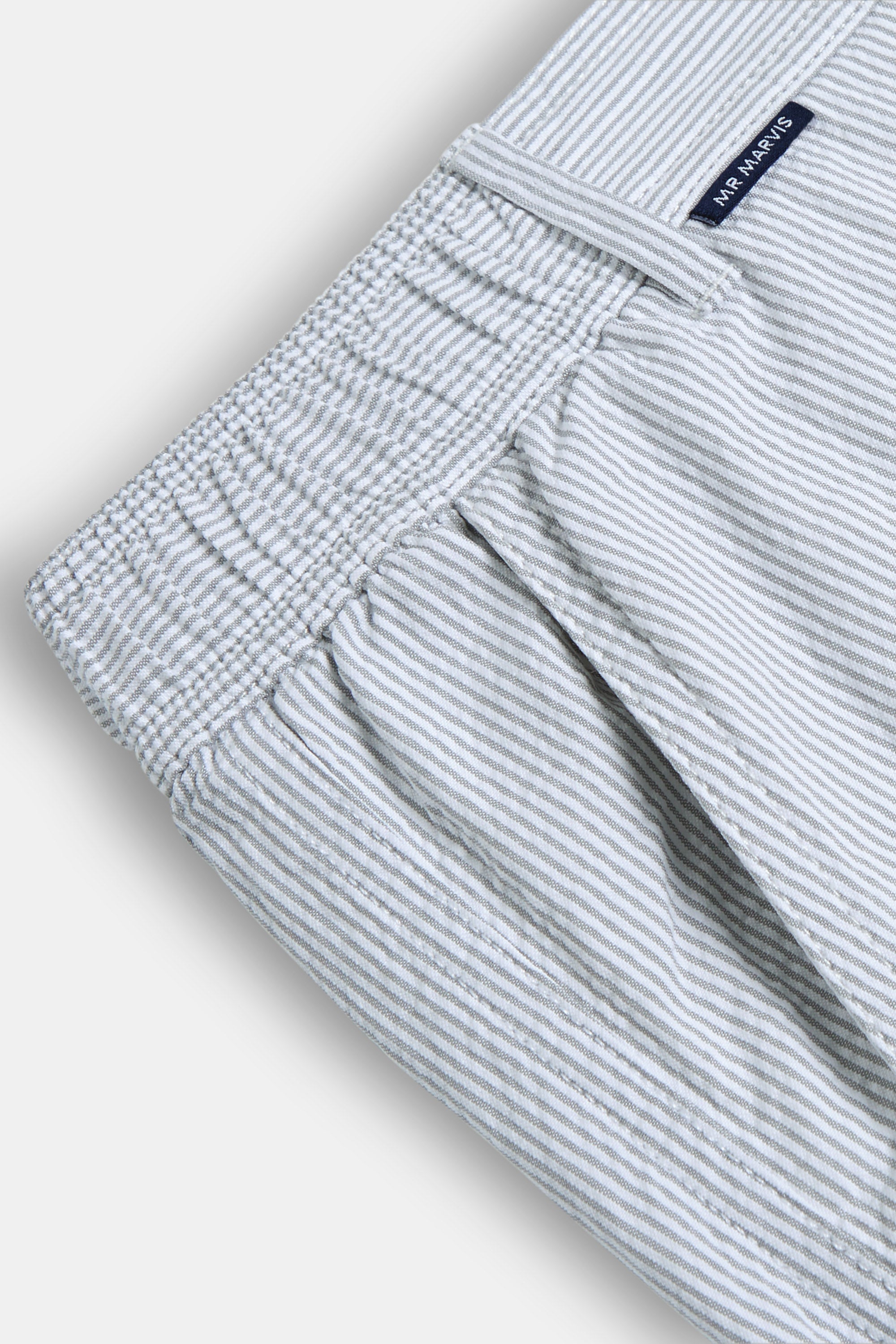 Meet The Seersuckers Runabouts: MR MARVIS' light grey and white striped 100% organic cotton men's shorts.